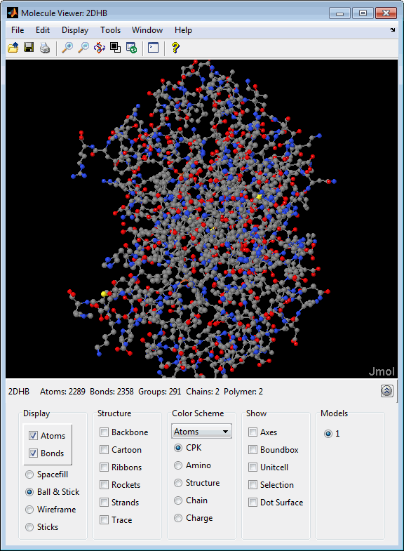 molviewer( считывает данные в файле модели молекулы, File)Fileи открывает приложение Molecule Viewer, отображающее 3-D молекулярную структуру для просмотра и манипуляции.