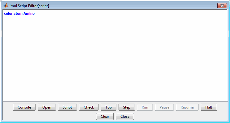 Существует известная ошибка с кнопкой «Открыть» редактора сценариев, которая предотвращает загрузку сценария Rasmol в интерактивном режиме. Вместо этого используйте evalrasmolscript функция, которая отправляет команды сценария RasMol в приложение Molecule Viewer. Кроме того, можно скопировать и вставить команды сценария в консоль сценария.