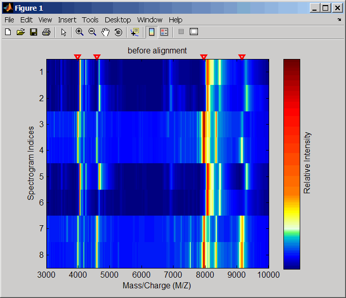 msheatmap(MZ_lo_res,Y_lo_res,'markers',R,'range',[3000 10000]) title('before alignment')