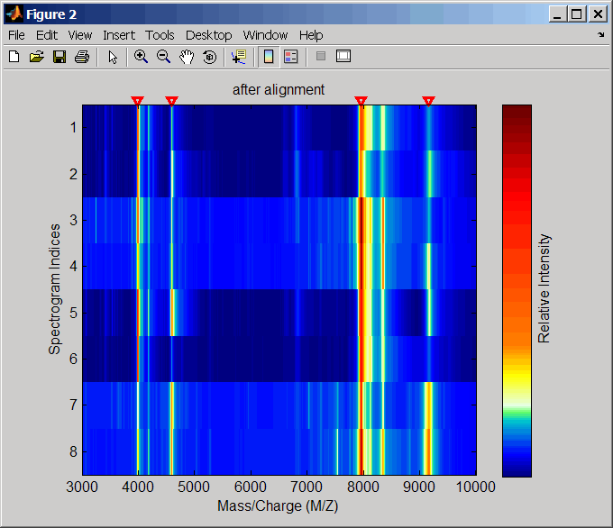 YA = msalign(MZ_lo_res,Y_lo_res,R,'weights',W); msheatmap(MZ_lo_res,YA,'markers',R,'range',[3000 10000]) title('after alignment')