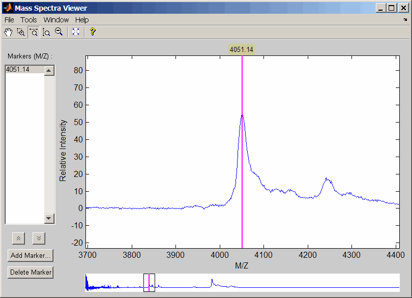 Используйте высокий пик около 4000 м/з в качестве опорного пика. Чтобы определить значение m/z опорного пика, щелкните