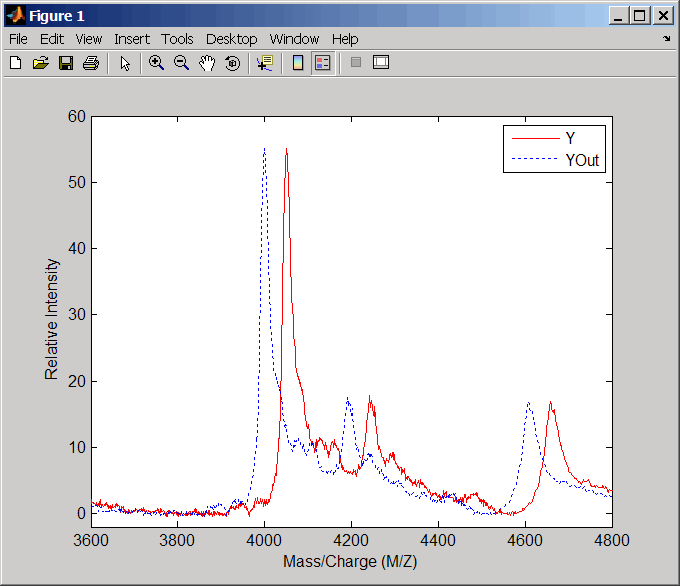 plot(MZ,Y,'r',MZ,YOut,'b:') xlabel('Mass/Charge (M/Z)') ylabel('Relative Intensity') legend('Y','YOut') axis([3600 4800 -2 60])