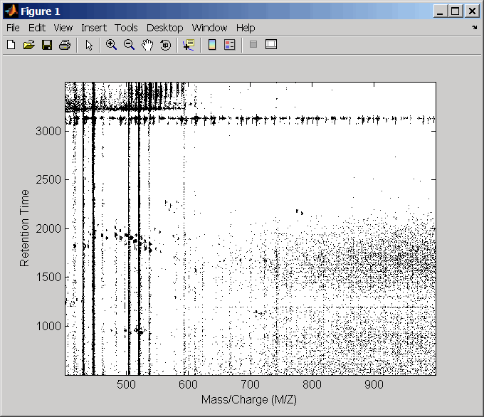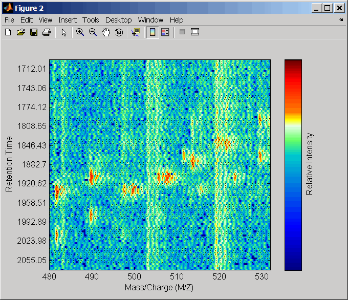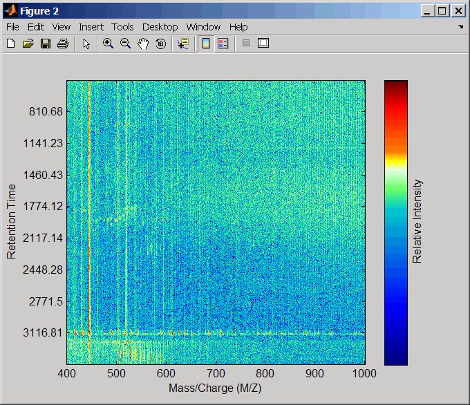 [MZ,Y] = msppresample(ms_peaks,5000); msheatmap(MZ,ret_time,log(Y))