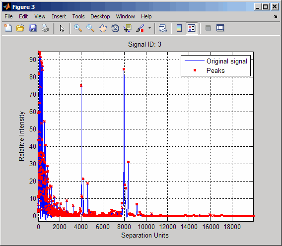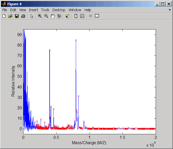 Q = cellfun(@(p) p(p(:,1)>2000,:),P,'UniformOutput',false); figure plot(MZ_lo_res,YS(:,3),'b',Q{3}(:,1),Q{3}(:,2),'rx') xlabel('Mass/Charge (M/Z)') ylabel('Relative Intensity') axis([0 20000 -5 95])