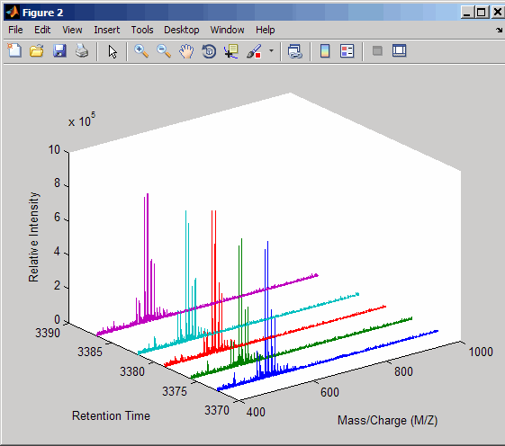 figure t1 = 3370; t2 = 3390; h = find(ret_time>t1 & ret_time<t2); [MZ,Y] = msppresample(ms_peaks(h),10000); plot3(repmat(MZ,1,numel(h)),repmat(ret_time(h)',10000,1),Y) xlabel('Mass/Charge (M/Z)') ylabel('Retention Time') zlabel('Relative Intensity')