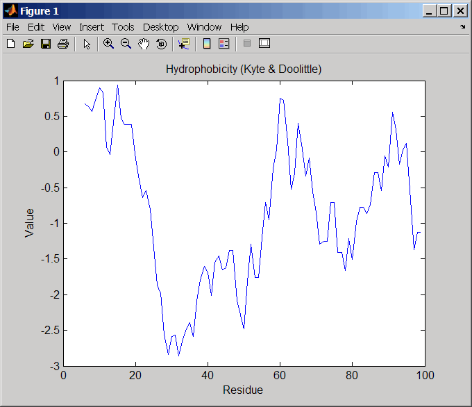 prion = getpdb('1HJM', 'SEQUENCEONLY', true);Постройте график гидрофобности (Kyte and Doolittle, 1982) остатков в последовательности.