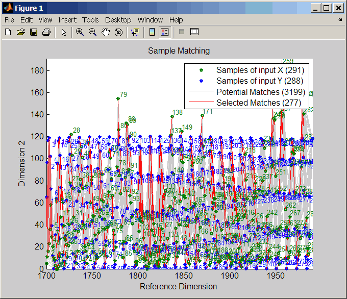 [i,j] = samplealign([years f(years)],sunspot,'weights',... [0 1],'showalignment',true);