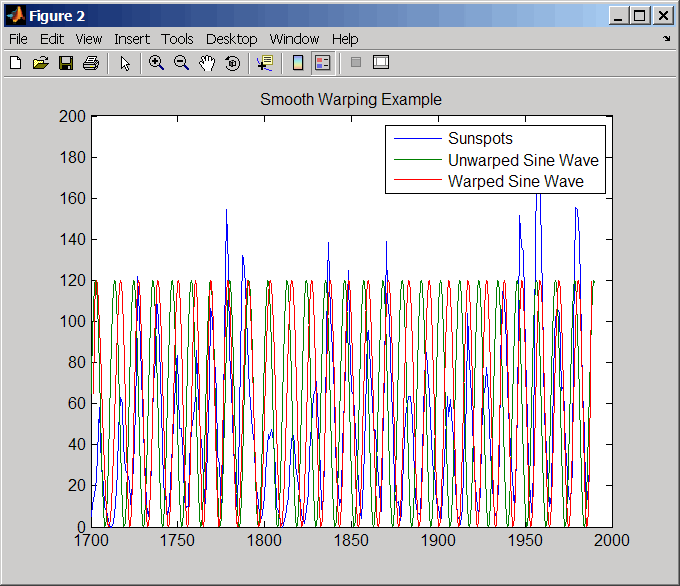 years = (1700:1/12:1990)'; figure plot(sunspot(:,1),sunspot(:,2),years,f(years),wy(years),... f(years)) legend('Sunspots','Unwarped Sine Wave','Warped Sine Wave') title('Smooth Warping Example')