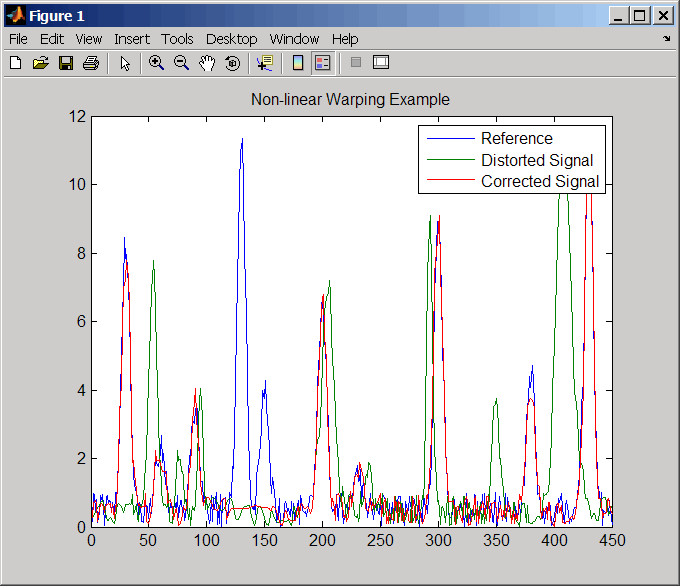 figure sig_3 = interp1(time,sig_2,interp1(i,j,time,'pchip'),'pchip'); plot(time,sig_1,time,sig_2,time,sig_3) legend('Reference','Distorted Signal','Corrected Signal') title('Non-linear Warping Example')