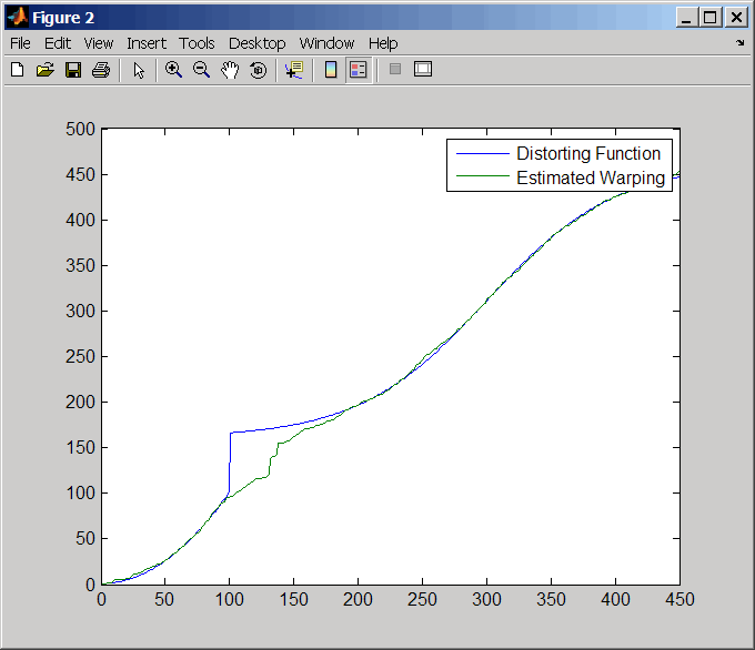 figure plot(time,wf(time),time,interp1(j,i,time,'pchip')) legend('Distorting Function','Estimated Warping')