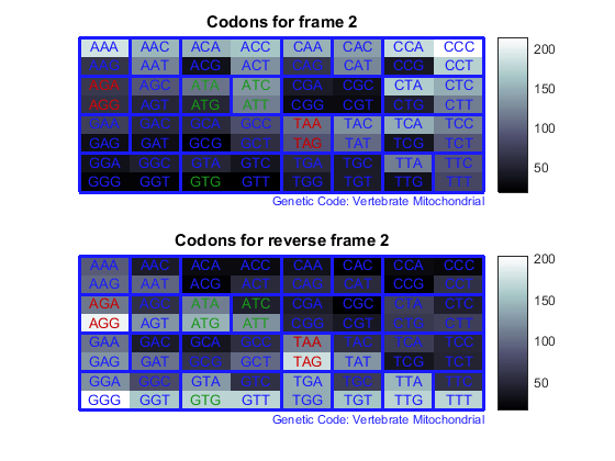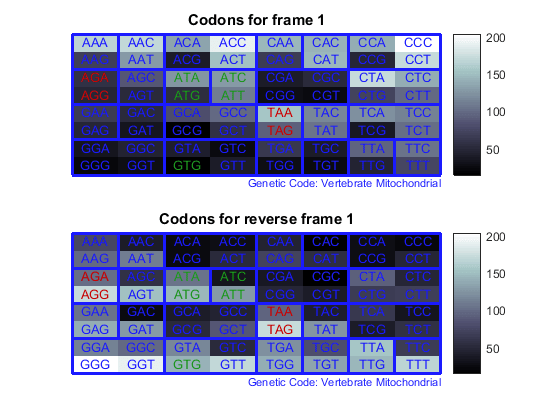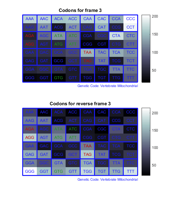 codoncount(mitochondria,'reverse',true,'frame',frame,...