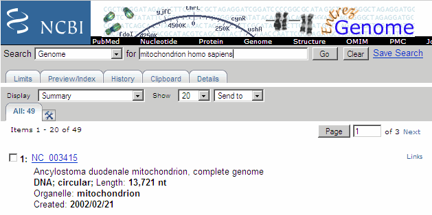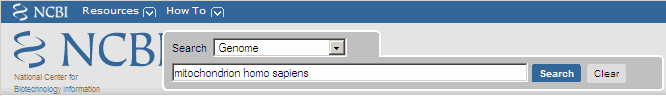 Поиск информации на веб-сайте NCBI. Например, для поиска генома митохондриона человека в списке Поиск выберите Genome и в списке «Поиск» введите mitochondrion homo sapiens.