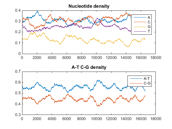 Следующая процедура иллюстрирует, как определить мономеры и димеры, а затем визуализировать данные на графиках и гистограммах. Участки последовательности ДНК с высоким процентом нуклеотидов A + T обычно указывают на межгенные части последовательности, в то время как низкие А + T и более высокие проценты нуклеотидов G + C указывают на возможные гены. Во много раз высокое содержание CG динуклеотида находится перед геном.