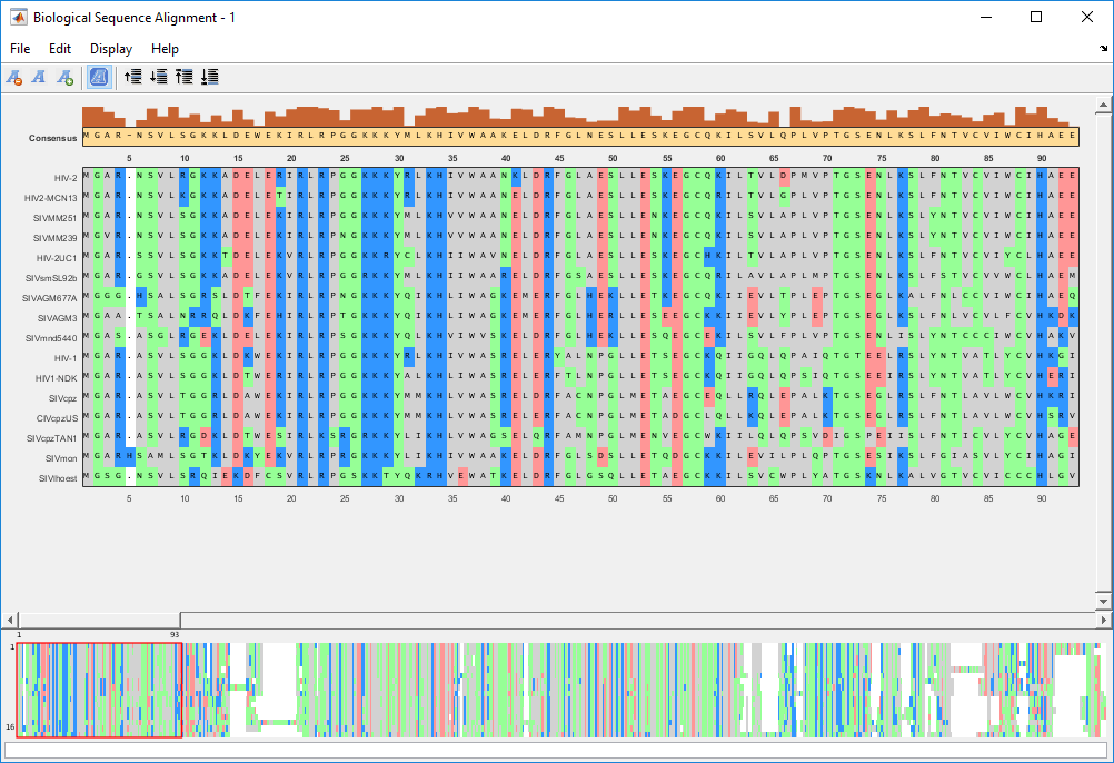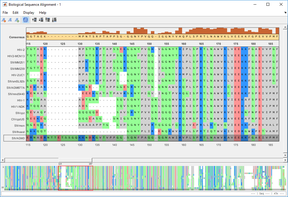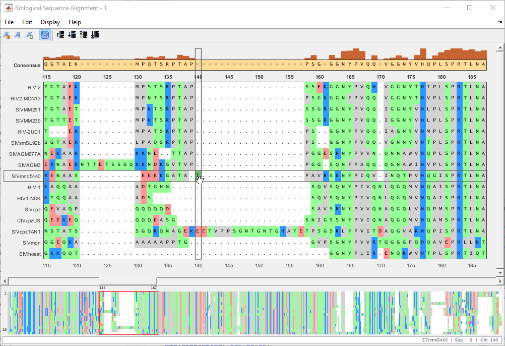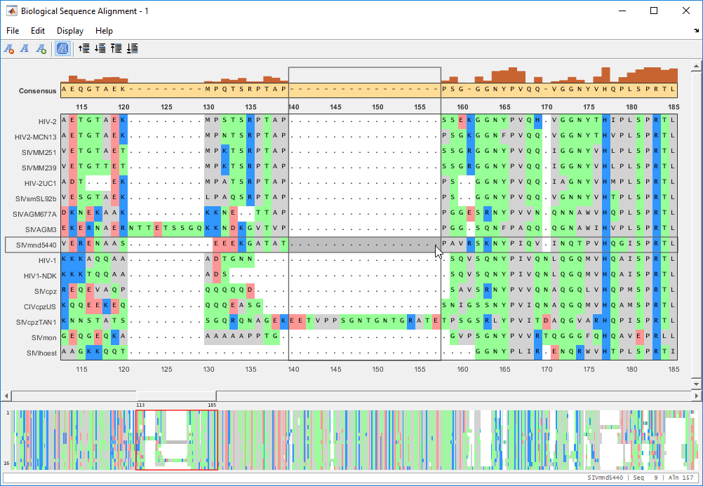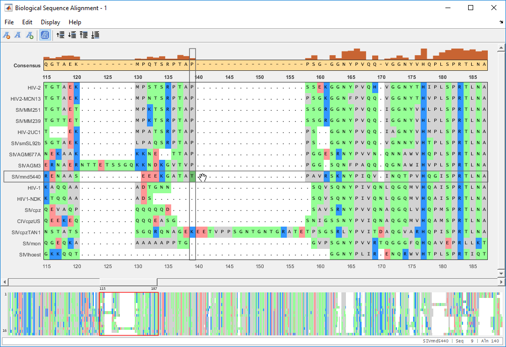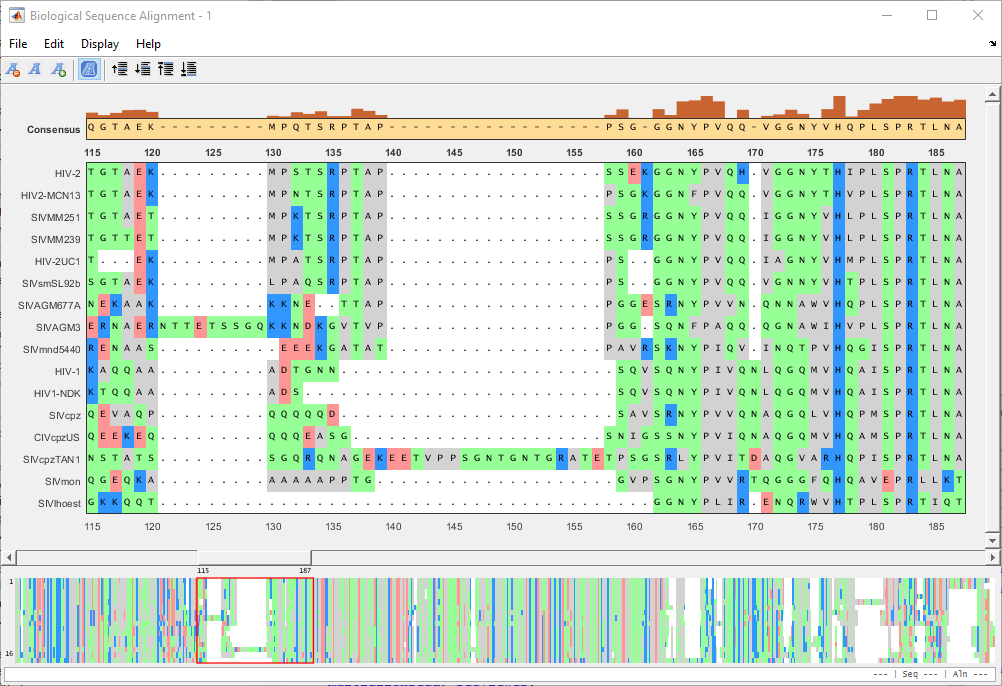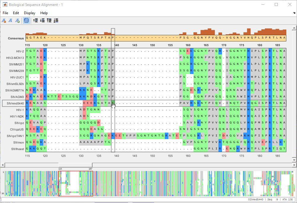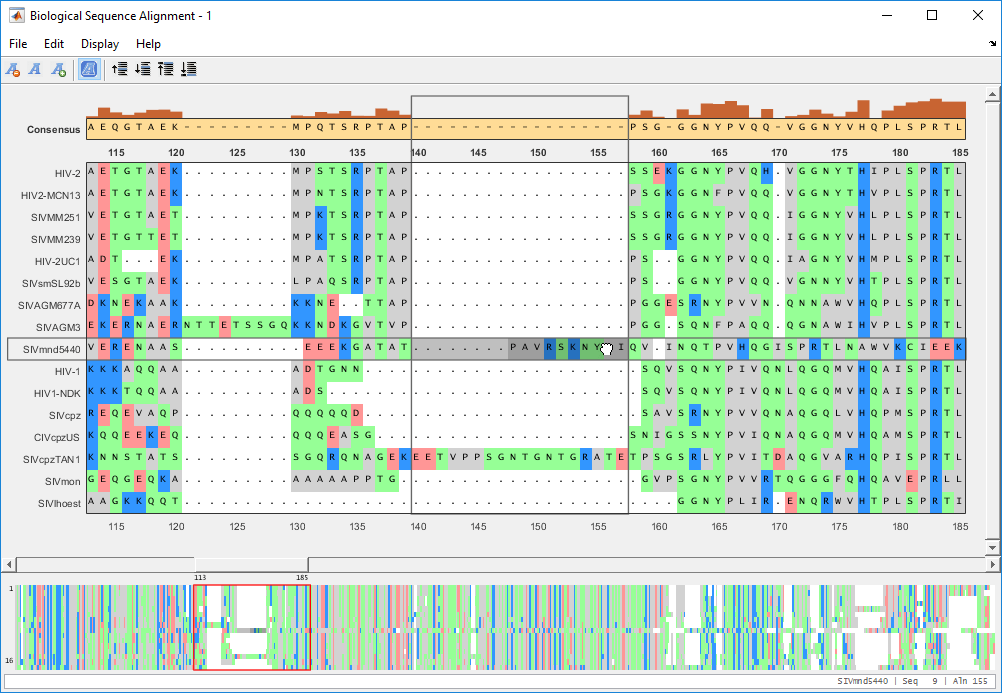 Прочитайте файл выравнивания нескольких последовательностей полипротеина gag для нескольких штаммов ВИЧ.