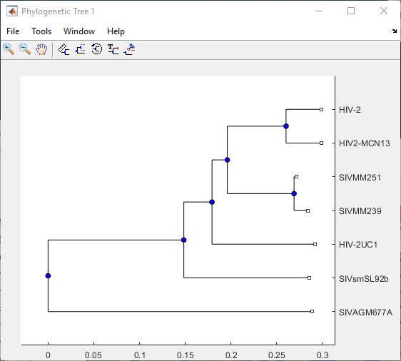 Филогенетическое дерево для последовательностей отображается в приложении Филогенетическое дерево. Дополнительные сведения см. в разделе Использование приложения филогенетическое дерево.