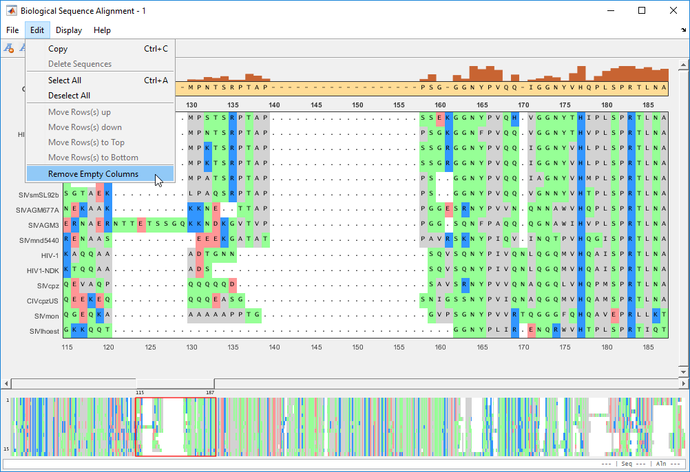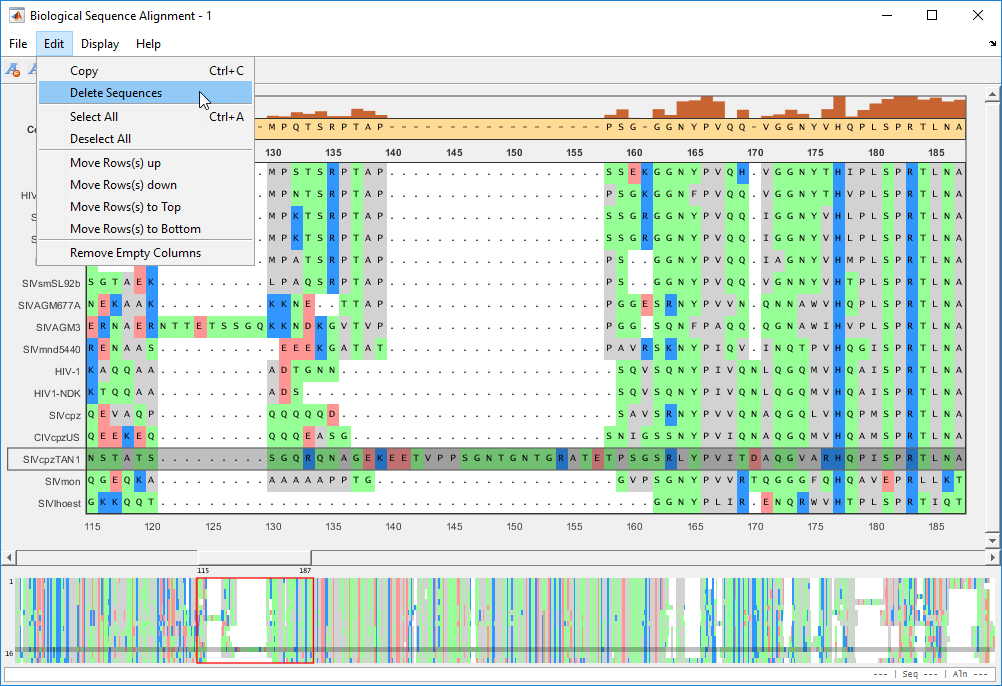 Предположим, что требуется удалить одну или несколько выровненных последовательностей. Сначала выберите удаляемые последовательности. Затем выберите меню «Редактирование» > «Удалить последовательности ».