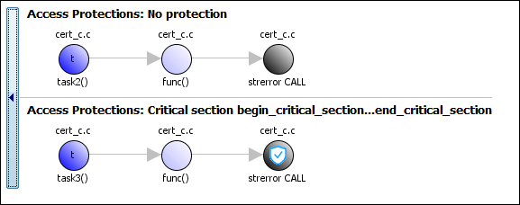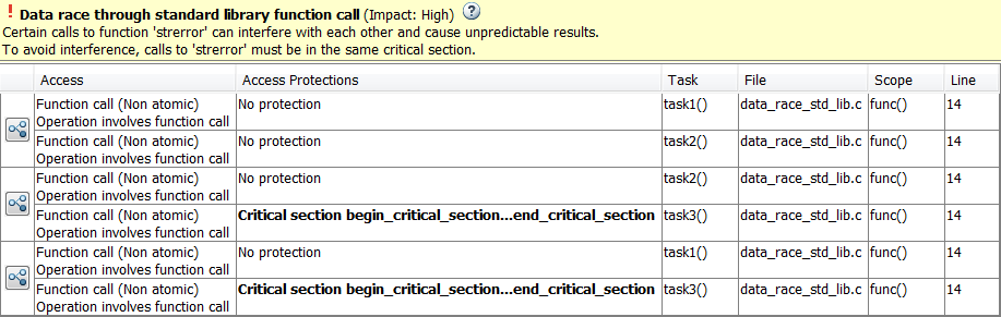 Чтобы определить существующие защиты, которые можно использовать повторно, см. таблицу и графики, связанные с результатом. В таблице показаны все пары конфликтующих вызовов. В столбце Access Protections отображаются существующие защиты для вызовов. Для просмотра последовательности вызовов функции, приводящей к конфликтам, щелкните