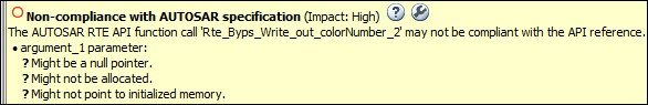 Более исчерпывающая версия той же самой проверки доступна с Code Prover. При проверке на наличие нарушений стандарта AUTOSAR на Rte_ вызов функции, средство проверки Prover кода рассматривает все пути выполнения, которые приводят к вызову функции (с учетом допущений проверки).