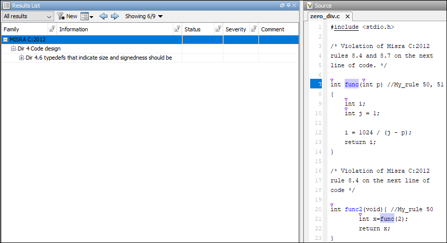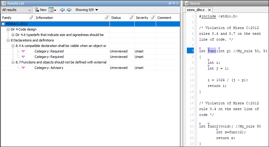 Комментарии кода My_rule 50, 51 и My_rule 50 не используйте синтаксис аннотации Polyspace. Вместо этого используется соглашение, в котором все правила MISRA помещаются в единый нумерованный список. В этом списке правила 8.4 и 8.7 соответствуют цифрам 50 и 51.Вы можете проверить этот код на наличие нарушений MISRA C: 2012, введя команду: