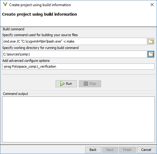 При нажатии кнопки «Выполнить» программа Polyspace запускает команду build и извлекает информацию для создания проекта Polyspace, в частности исходные пути и информацию компилятора.