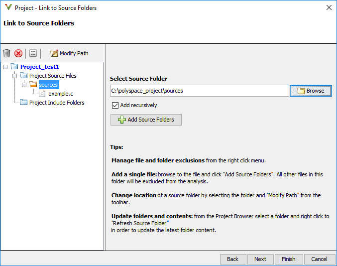 Чтобы начать анализ Polyspace ®, необходимо указать путь к исходным файлам и заголовкам.