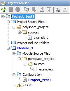 Укажите исходные пути в проекте Polyspace. Исходные файлы отображаются на панели «Диспетчер проектов».