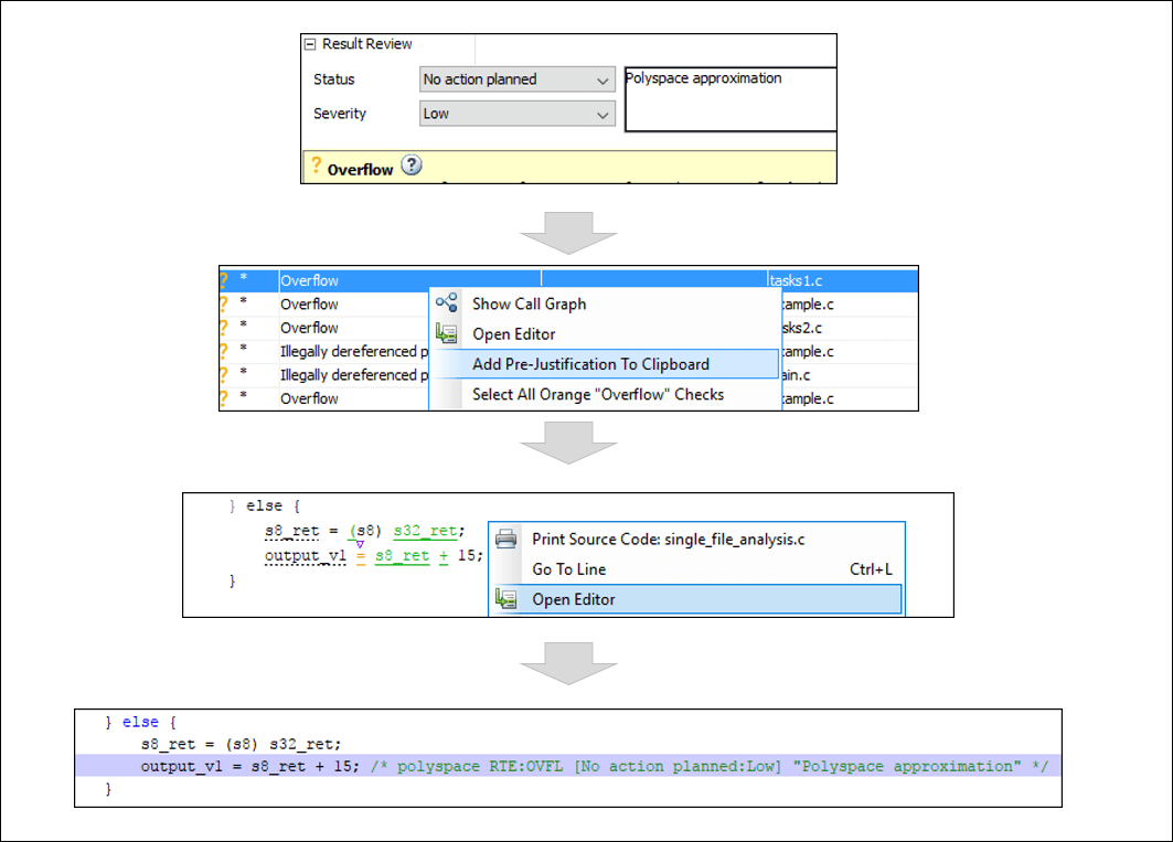 Аннотацию можно ввести непосредственно или скопировать из интерфейса пользователя. В интерфейсе пользователя для копирования аннотаций щелкните правой кнопкой мыши результат и выберите «Добавить предварительное выравнивание в буфер обмена». Откройте исходный код в редакторе и вставьте его в ту же строку, что и результат. При выполнении этого рабочего процесса в Polyspace предполагается, что установлен статус No Action Planned. Программа скрывает результат из всех мест (за исключением отчетов, необходимых для сертификации). Единственными исключениями являются критические для безопасности проверки времени выполнения программы Code Prover, которые скрыты из списка результатов, но не из исходного кода.