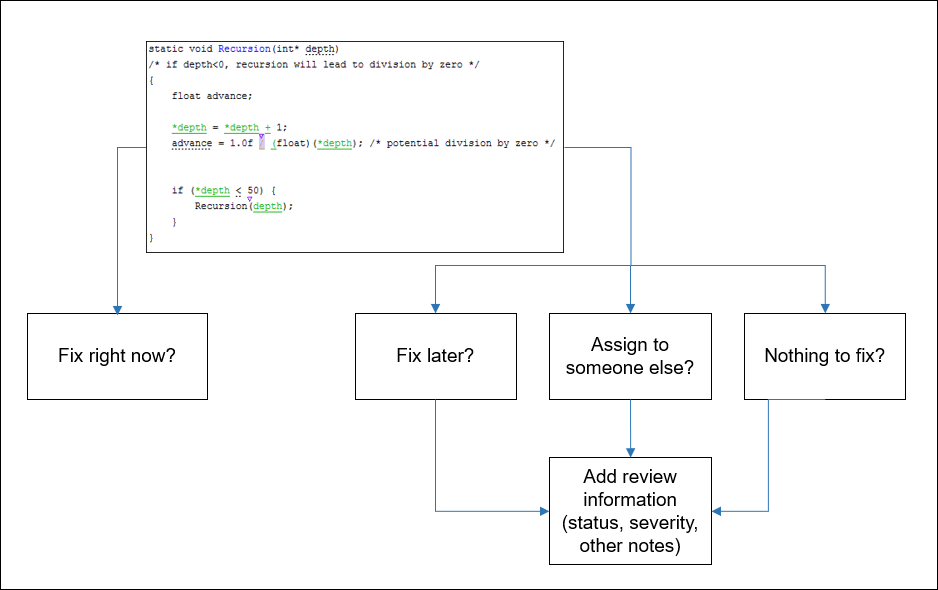 При вводе комментариев или аннотаций кода в определенном синтаксисе программа может считывать их и заполнять поля Серьезность (Severity), Статус (Status) и Комментарий (Comment) в следующем анализе кода.