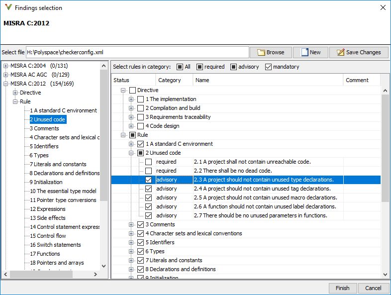 Можно указать предопределенное подмножество правил, например, mandatory для C:2012 MISRA. Эти подмножества обычно определяются стандартом.