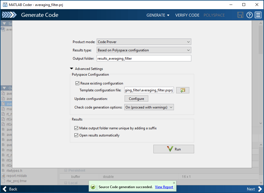 Если изменить некоторые параметры по умолчанию на панели Конфигурация (Configuration), обновленная конфигурация будет сохранена как .psprj в папке результатов. С помощью этого файла можно повторно использовать конфигурацию в нескольких проектах кодера MATLAB.