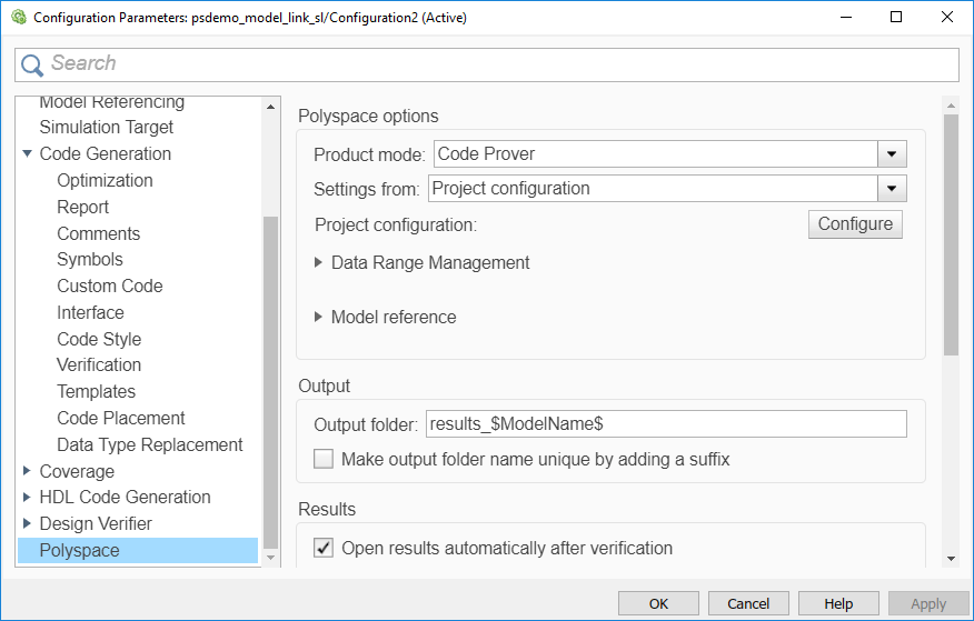 Чтобы открыть параметры Polyspace в окне Simulink Configuration Parameters, на вкладке Apps выберите пункт Polyspace Code Verifier. Затем на вкладке «Полиспейс» выберите «Параметры» или «Параметры» > «Параметры полиспейса».