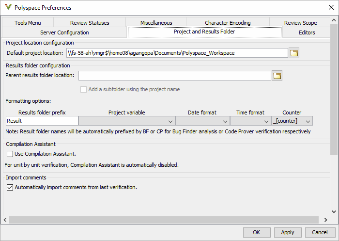 Окна: $Drive\Users\$User\AppData\Roaming\MathWorks\MATLAB\$Release\Polyspace\polyspace.prf