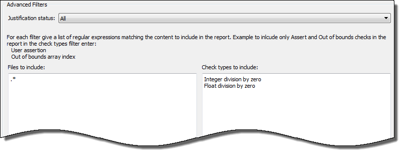 Чтобы включить только целочисленное деление по нулю и плавающее деление по нулю дефектов, в группе Дополнительные фильтры введите Integer division by zero и Float division by zero в поле Типы проверки для включения.