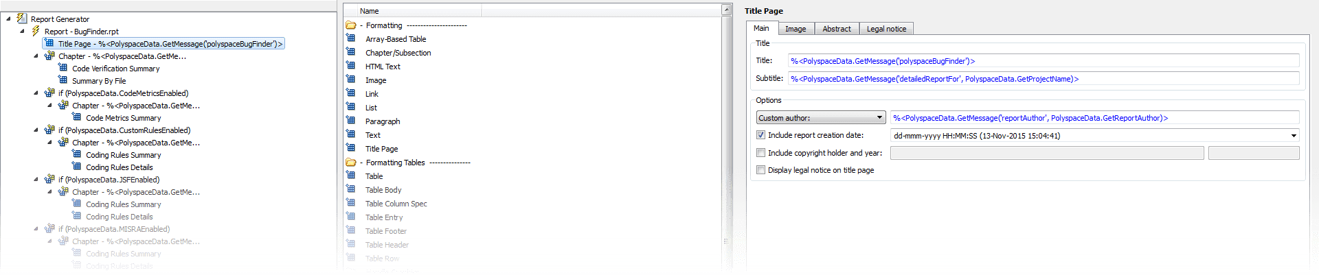 Шаблон BugFinder находится в где polyspaceroot/toolbox/polyspace/psrptgen/templates/bug_finder является папкой установки Polyspace.polyspaceroot