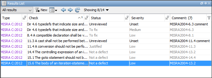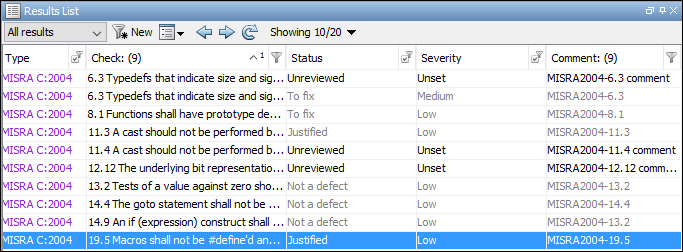 Программа сопоставляет значения MISRA C: 2004 Status, Severity и Comment, добавленные через интерфейс пользователя или аннотации кода, с соответствующими результатами MISRA C: 2012, если результаты существуют. Дополнительную информацию о картировании см. в добавлении 1 к публикации MISRA C: 2012.