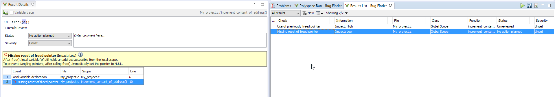 После анализа результаты появятся на панели Список результатов (Results List). Щелкните каждый результат, чтобы просмотреть исходный код и сведения на панели Сведения о результате.
