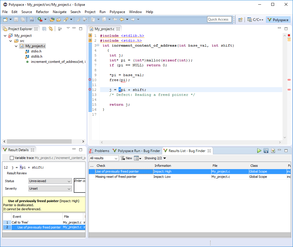 При разработке кода в Eclipse или среде IDE на основе Eclipse можно установить подключаемый модуль Polyspace и выполнить анализ Polyspace для исходных файлов в проекте Eclipse. Можно проверять наличие ошибок при каждом сохранении кода или явном выполнении анализа.
