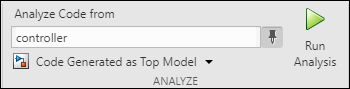 Чтобы проанализировать код, созданный в модели, щелкните в любом месте холста. В поле Analyze Code from отображается имя модели. Выберите Выполнить анализ (Run Analysis).