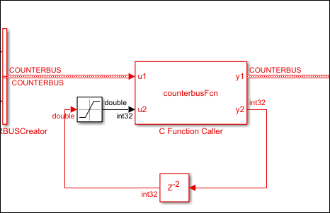 limit = u1->inputsignal.input + u2;counterbusFcn, которые, в свою очередь, поступают с этих входов в блок C Caller: