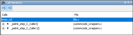 На панели «Иерархия вызовов» в качестве вызывающих абонентов отображаются две функции-оболочки. Каждая функция оболочки представляет блок вызывающего абонента C в модели.