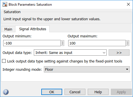 На вкладке Атрибуты сигнала (Signal Attributes) укажите минимальное и максимальное значения для вывода блока насыщения.