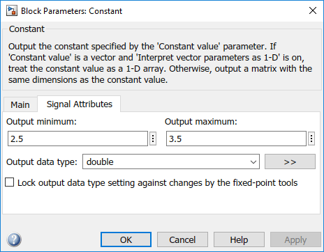 Например, хотя блок константы имеет постоянное значение, установленное равным 3, расчетный диапазон для проверки составляет от 2,5 до 3,5.
