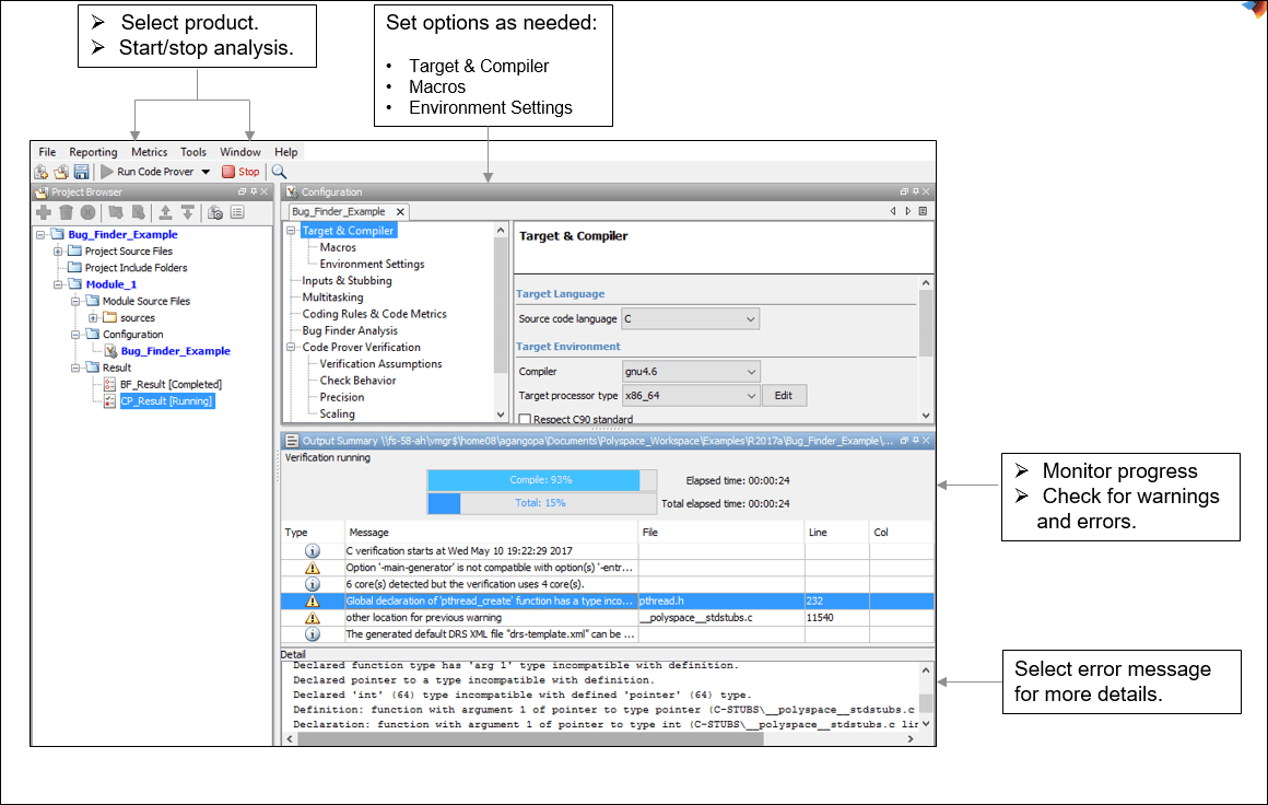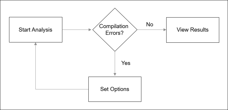 После указания исходных файлов и компилятора запустите анализ Polyspace. Во время анализа Polyspace сначала компилирует код, а затем проверяет наличие ошибок (Bug Finder) или доказывает правильность кода (Code Prover). При возникновении ошибок компиляции прочитайте сообщение об ошибке и определите причину ошибки. Чтобы устранить ошибки, часто необходимо задать некоторые опции конфигурации Polyspace и повторно запустить анализ.