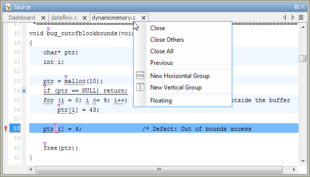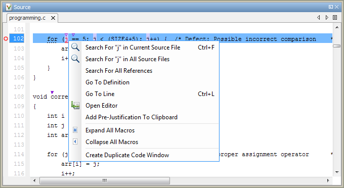 Перейти к определению - переход к строке кода, содержащей определение i. Программное обеспечение поддерживает эту функцию для глобальных и локальных переменных, функций, типов и классов. Если определение недоступно для Polyspace ®, при выборе этой опции происходит переход к объявлению.