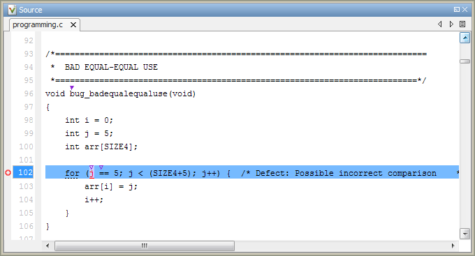 На панели «Источник» отображается исходный код с дефектами, окрашенными в красный цвет, и соответствующим номером строки.