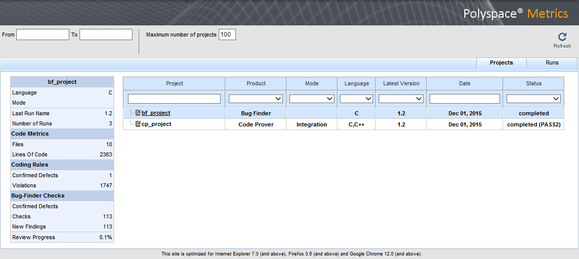 На главной странице Metrics можно просмотреть все проекты, загруженные в репозиторий Polyspace Metrics.