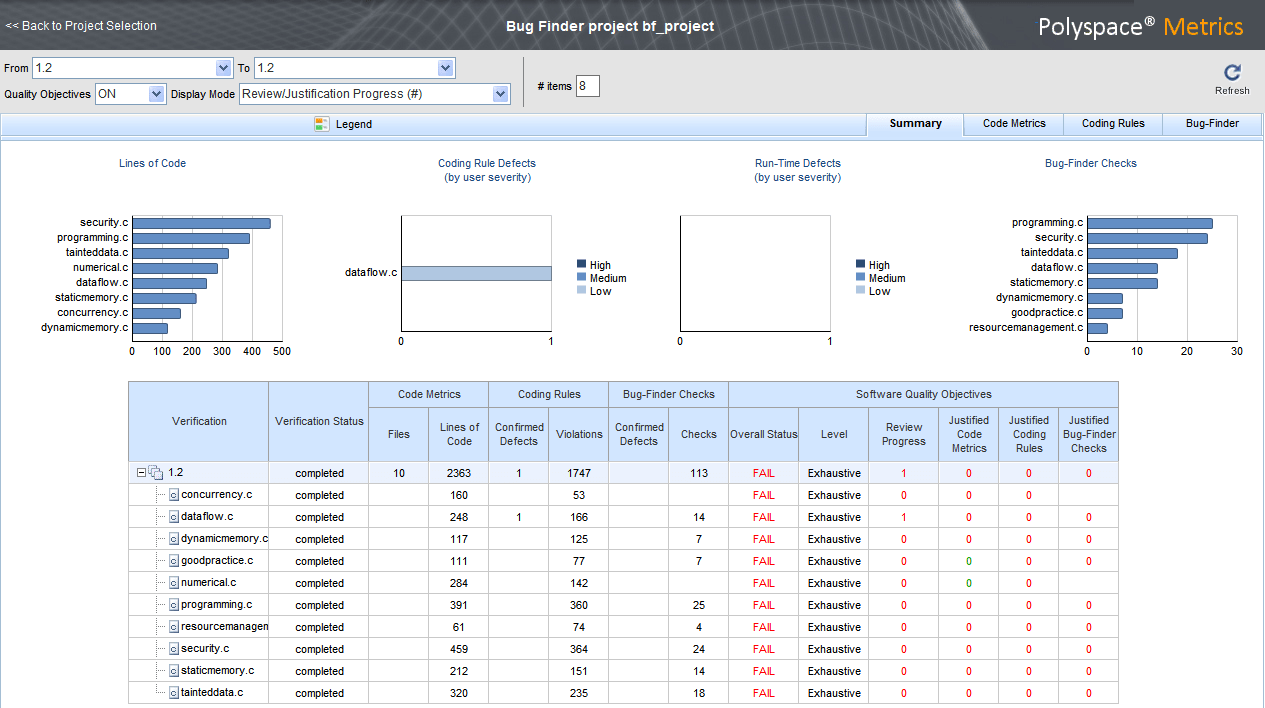 В столбце Подтвержденные дефекты (Confirmed Defects) перечисляется количество нарушений правил кодирования или проверок, рассмотренных вами и назначенных серьезности High, Medium, или Low в интерфейсе пользователя Polyspace.