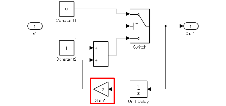 Модель расположена так, что выходной сигнал находится справа. Выходной сигнал блока задержки находится слева.