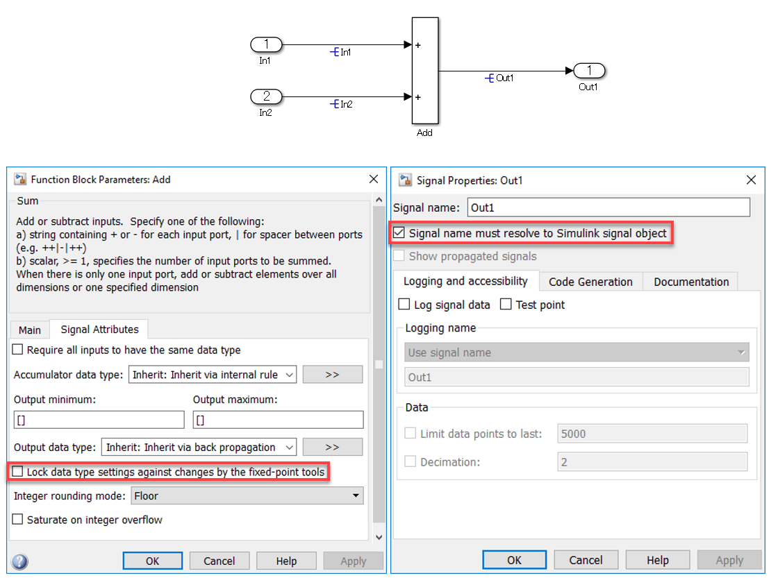 Когда тип данных fixdt (фиксированная точка), тип данных должен быть задан отдельно, поскольку каждый блок может иметь различные точки данных. В этом сценарии невозможно использовать только объект данных для установки типа данных.