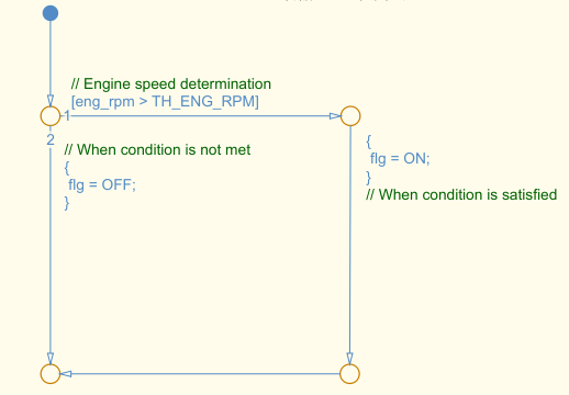 Комментарии в метках перехода должны располагаться над условиями перехода, действиями условий, действиями перехода и событиями Stateflow.